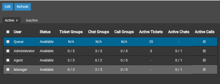 The User Dashboard does reflect the agents who are currently active for chats. If an agent is listed on the Inactive tab, then they are not marked as active for chats or tickets. If an agent is listed on the Active tab, then they are marked as active for tickets or chats. You can determine if an Active Agent is available for chat by looking at the Chat Groups column. In the below screenshot, you can see that Administrator is available for chats in all three assigned groups, Agent is not available in either of their two assigned groups, and Manager is available in two of three assigned groups.