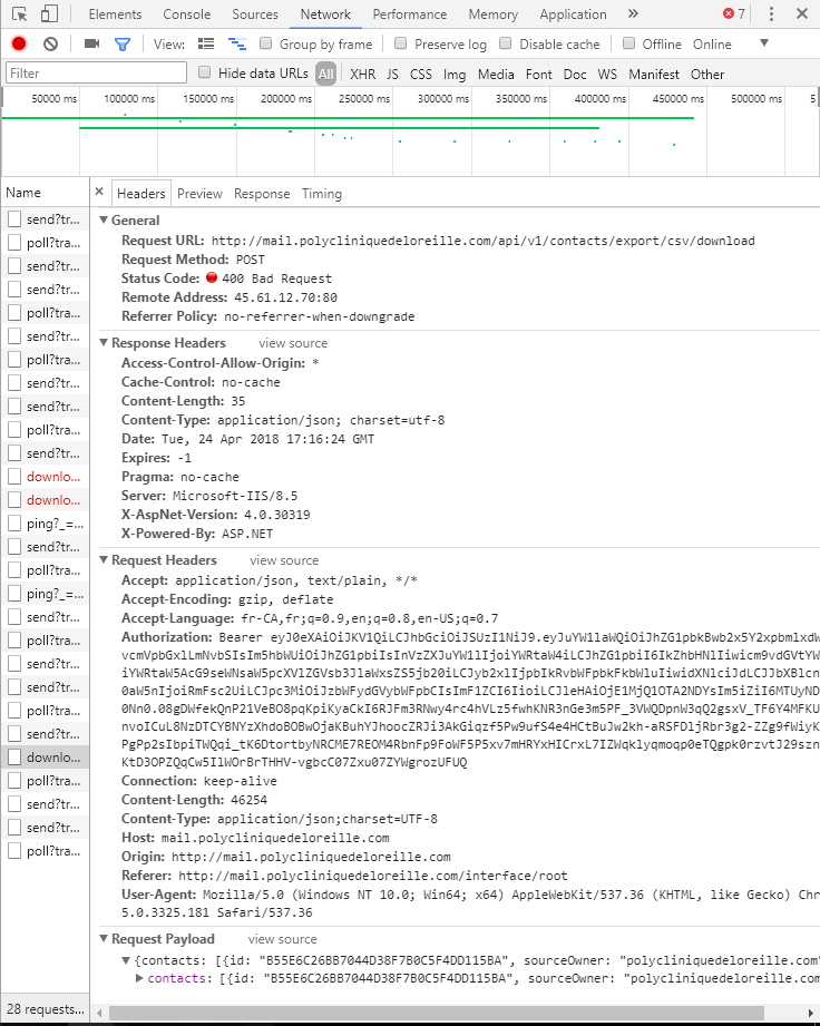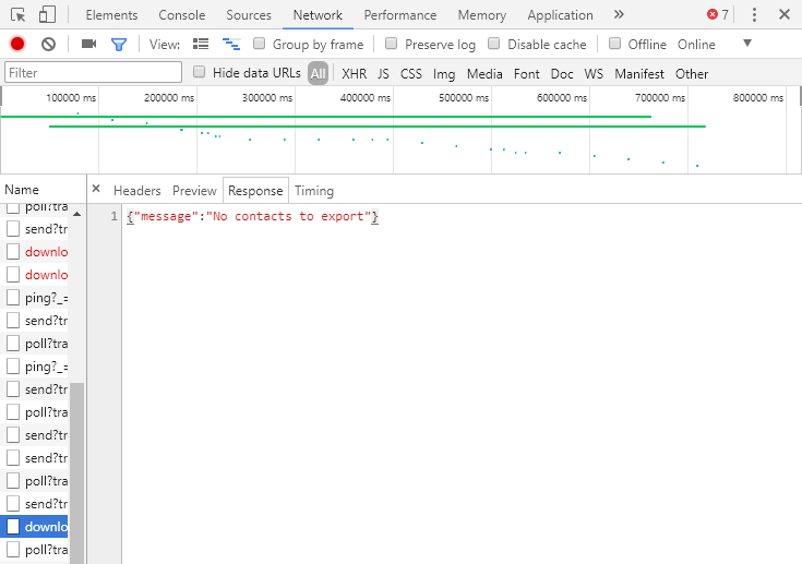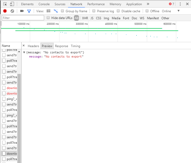 Pascale, can I have you open the developer tools in the web browser?  This is accomplishing by inspecting on the web page itself or pressing F12 in most Windows browsers.  Then make sure the Network tab is selected.  Try to perform the contact export.  If any of the API calls are failing, it should be annotated in red with a 400 response code.  Click on the error, if present, and take a screenshot of the error--both the headers and the preview response.  This will help in tracking down the error.  Let me know if you have any questions.