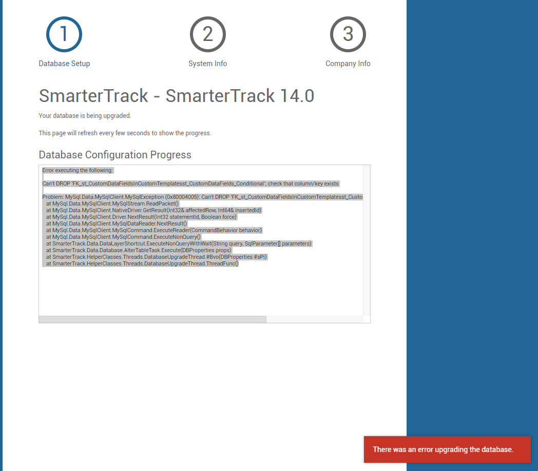 Smartertrack 13 -> SmarterTrack 14 upgrade fail