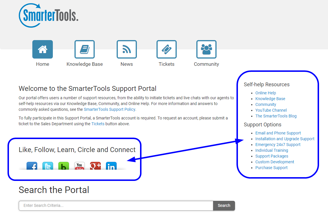 The social media links and bulleted menu items on our main portal page are not a native part of SmarterTrack. We added these items using the Main Portal Announcement. In order to get these items to appear the way they are displayed on the main portal page, we added some custom CSS using the Custom CSS Style Overrides setting. Both Main Portal Announcement and Custom CSS Style Overrides are brand settings, and are on the Custom Messages and Portal Options tabs, respectively.