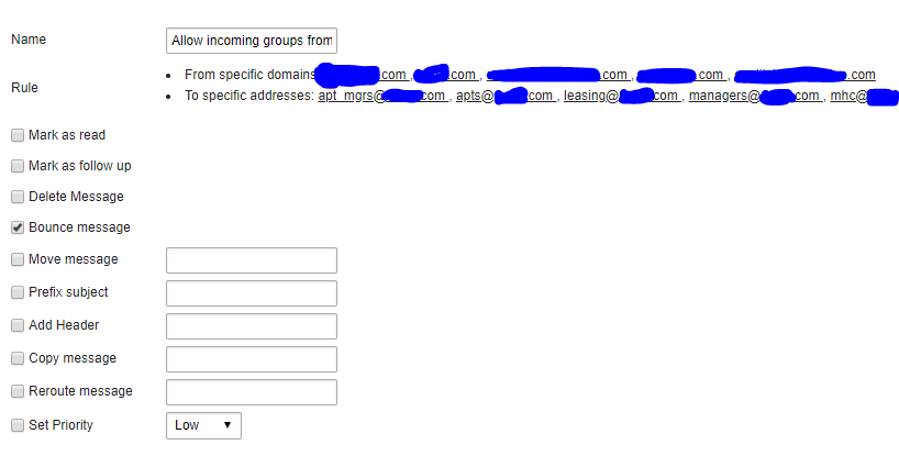 From specific domains (does not match) - to specific addresses (matches) - AND (all rules must be met) - Bounce Message.