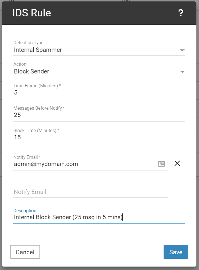 Daniel, there is an IDS rule that you can create on your system called "Internal Spammer".  It will allow you to Notify an administrator, block the sender, or quarantine the messages.  You can specify how many messages within a certain time frame will trigger the block and how long you want the block / quarantine to be in affect.  It is located in System Admin > Settings > Security > IDS Rules.  Below is an example of a rule you could set.  Tailor it to your system and mail usage.
