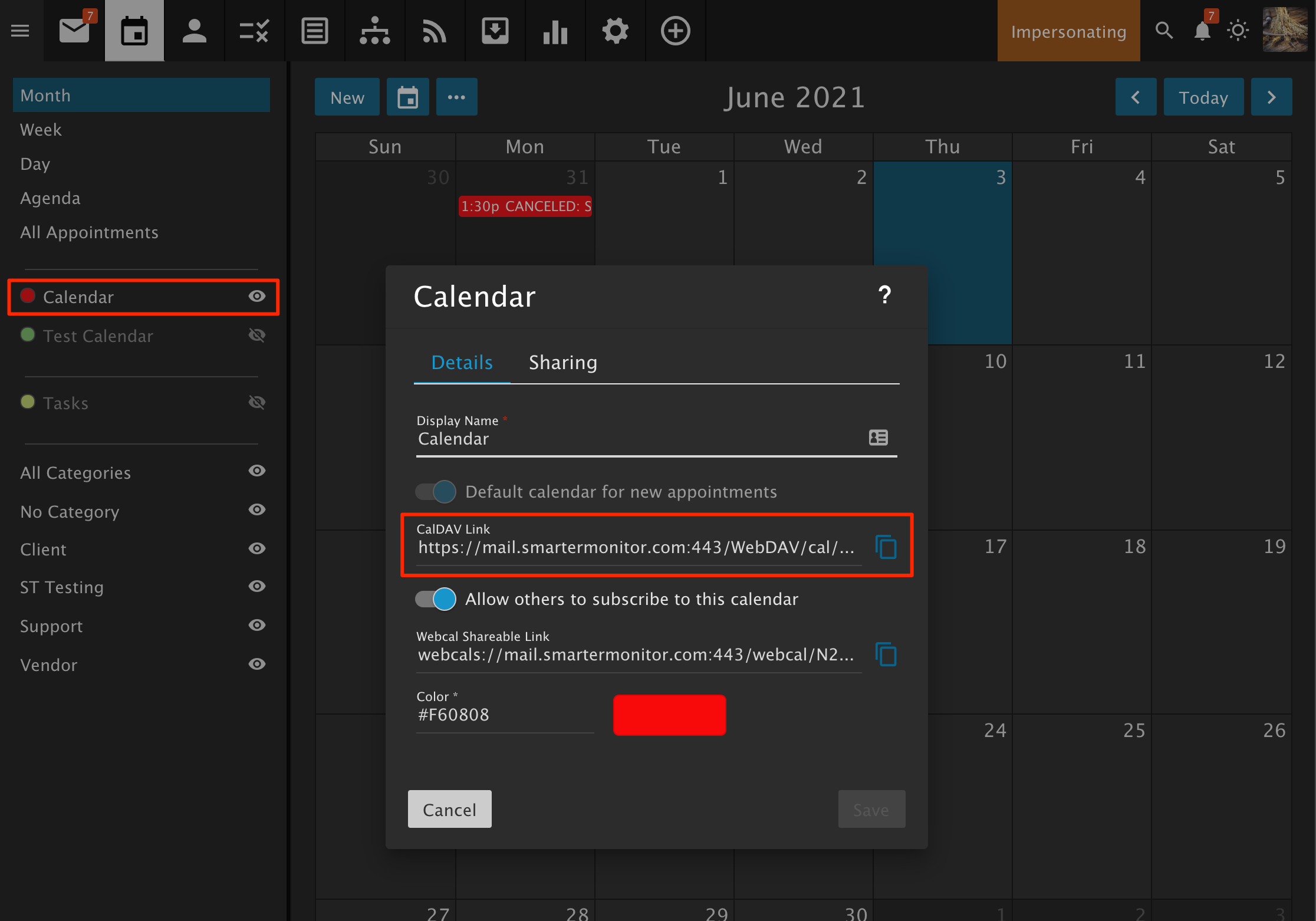 Harmonizely does integrate well with SmarterMail and leverages CalDAV to do so. You can acquire the CalDAV URL for configuration by clicking on the calendar entry on the menu to the left in the Calendar interface in webmail as you'll see here: