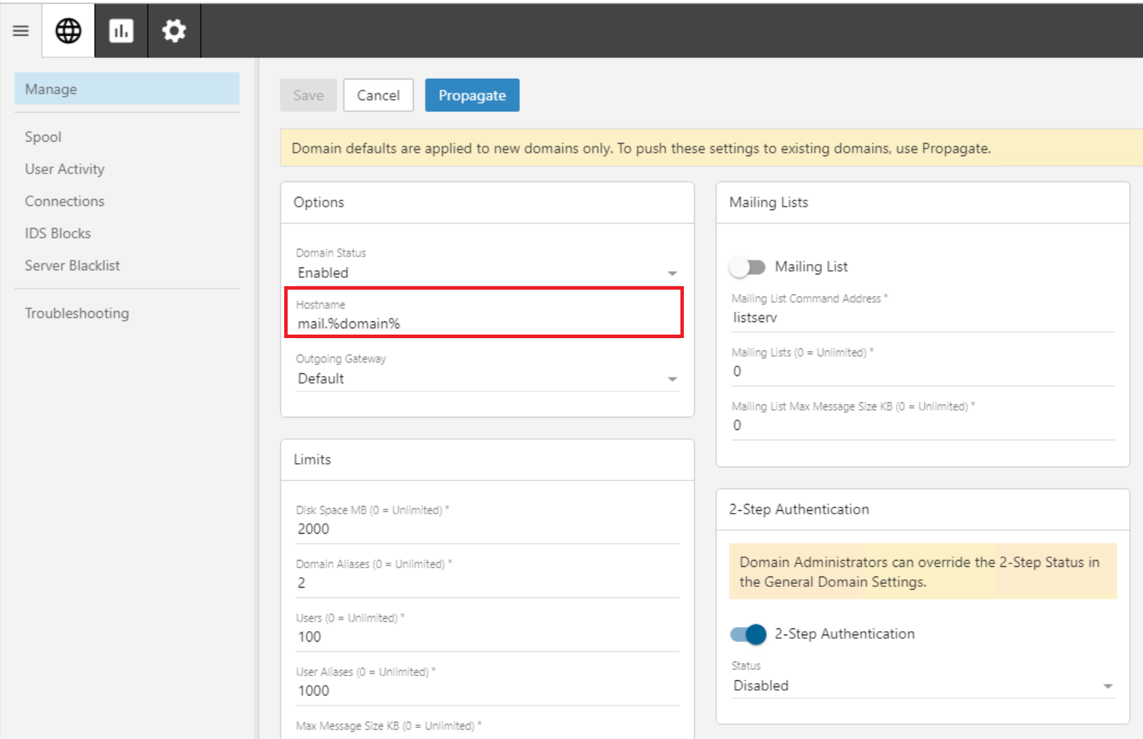 Once the domain defaults have been updated you can then use the Propagate button to push these settings changes to all domains.