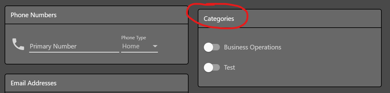 In the modal that pops up, enter a name for your new category and save it.  Now when you're viewing a contact, you can put it into the new category by using the toggle next to the category name.