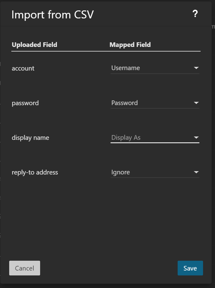 And would map to the matching fields in the drop box. This seems to work as now the Display Name shows in the account details (but still doesn't show in the full list of users). This should be fine for what I'm doing. If the end users want to put in a different reply address, they can do some themselves (will send out a message to all new users to check out their profiles and fill in any missing data).