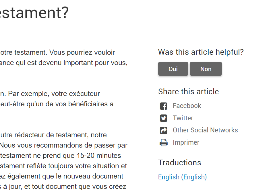 1) For the menu which appears on the right-hand side of every article in the French (Canada) knowledge base, translate “Was this article helpful?” to “Est-ce que cet article a été utile?” and “Share this article” to “Partagez cet article”. These statements are currently in English for all French (Canada) knowledge base articles.