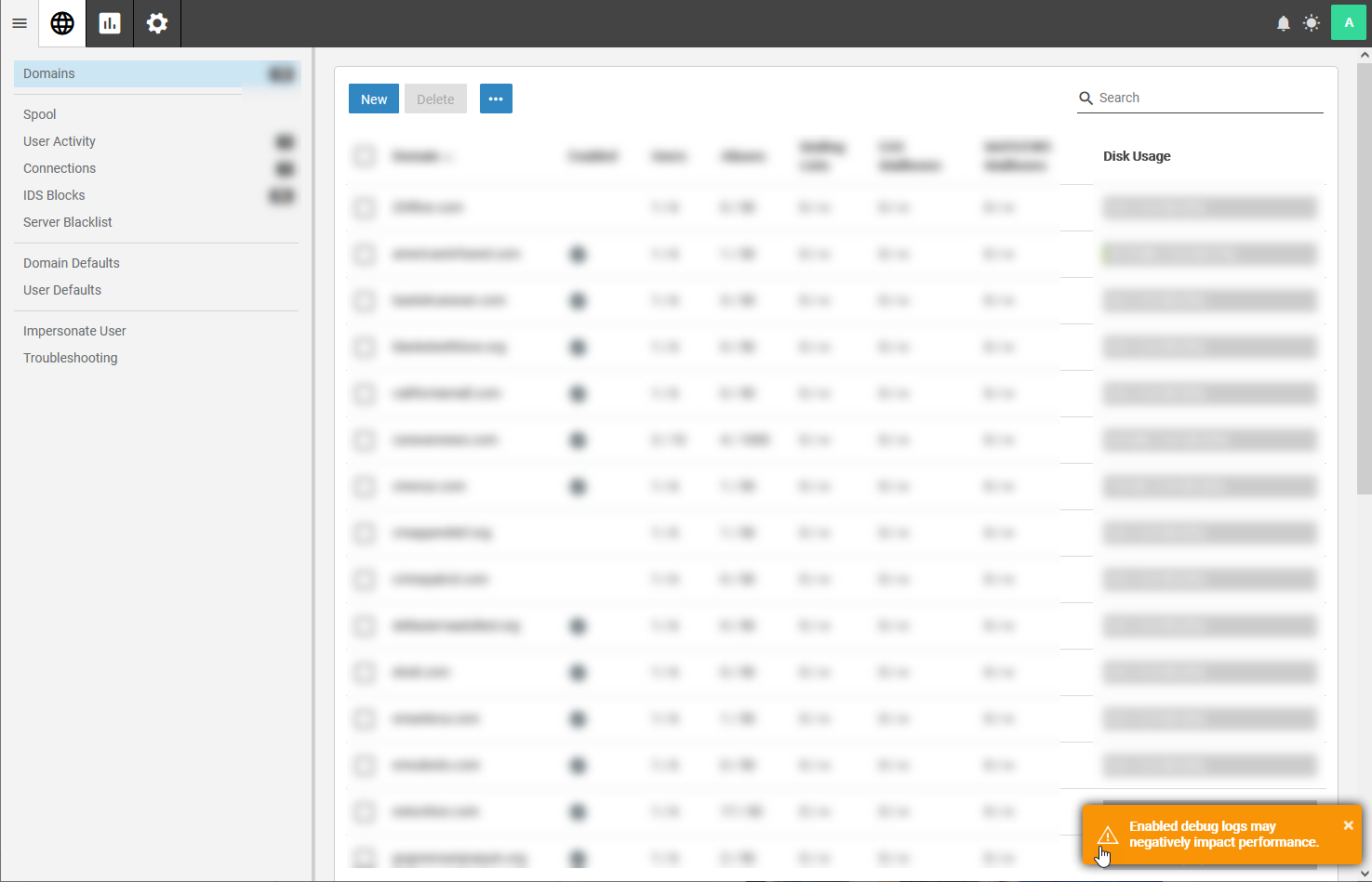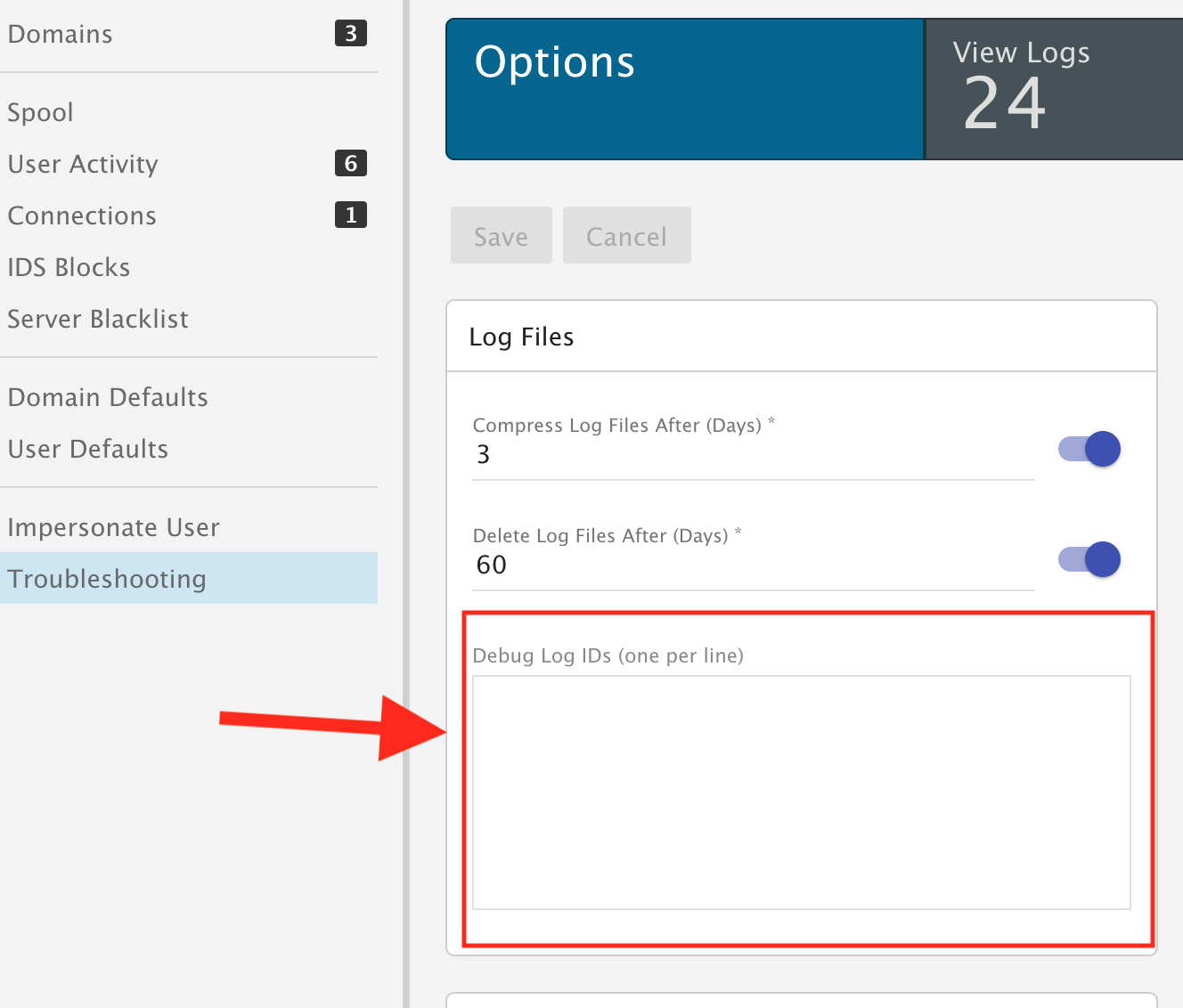 Debug Log IDs (one per line) - This section should only be used when instructed by SmarterTools Support. In order to better troubleshoot an issue within SmarterMail, SmarterTools Support may require additional logging. In this section, Debug Log IDs can be entered. Entering a log ID in this box will enable the creation of a separate log file which will contain information Support needs for troubleshooting. To disable a specific log, simply remove it from the list.a