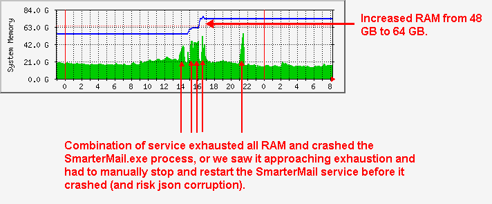 Reason:  We are experiencing continued memory run-away conditions where RAM utilization will suddenly jump from a fairly constant ~20 GB, all the way to maximum installed (currently 64 GB).  We get alarms and texts when it approaches, and if we don't rush to manually stop the SmarterMail process, it will fully exhaust 100% of physical memory and virtual memory (swap space), to the point the SmarterMail process crashes.