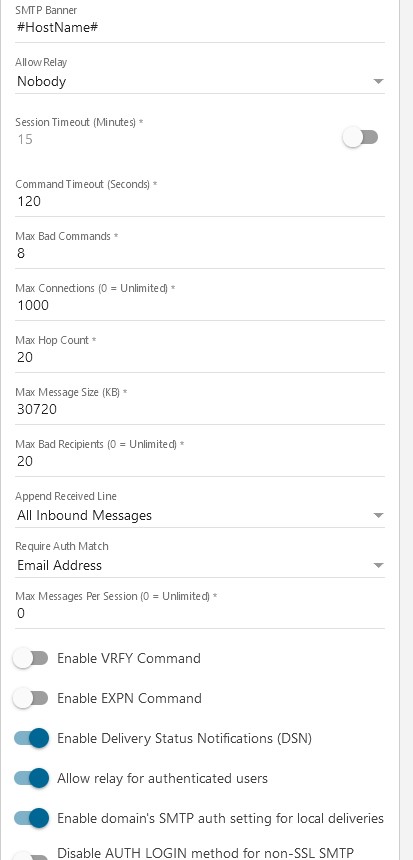 Enable VRFY command - Enable this setting to allow others (including other mail servers) to verify an email address on the server. Note: Some people believe enabling VRFY commands is a security risk, so be sure to research the possible ramifications before enabling this feature.