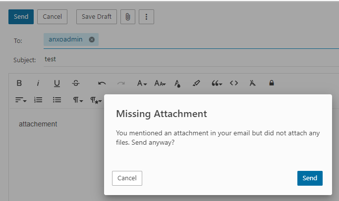For the recent builds (not only the newest one), I found if we have the word "attachment" within the email, and if we have no any attachment within the email, the webUI will show "Missing Attachment" warning.