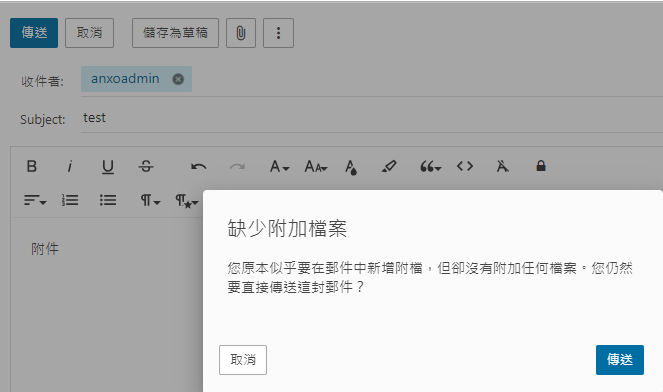 If I switch to Chinese webUI, then there's no warning if I am typing  "attachment" (in English), but it will show "Missing Attachment" if I am typing "attachment" in Chinese character(附件).