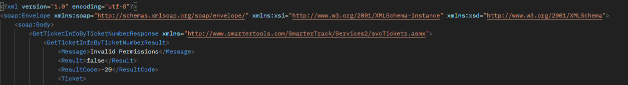 I am trying to query a simple ticket that I opened using local smartertrack. I have my account set to administrator. When I run a SOAP request it gives me the following XML response: