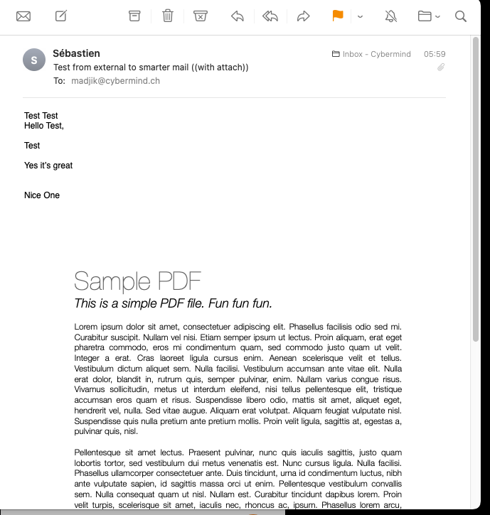 I connected a Mac mail to a test account via SMTP/IMAP and sent a mail to itself.