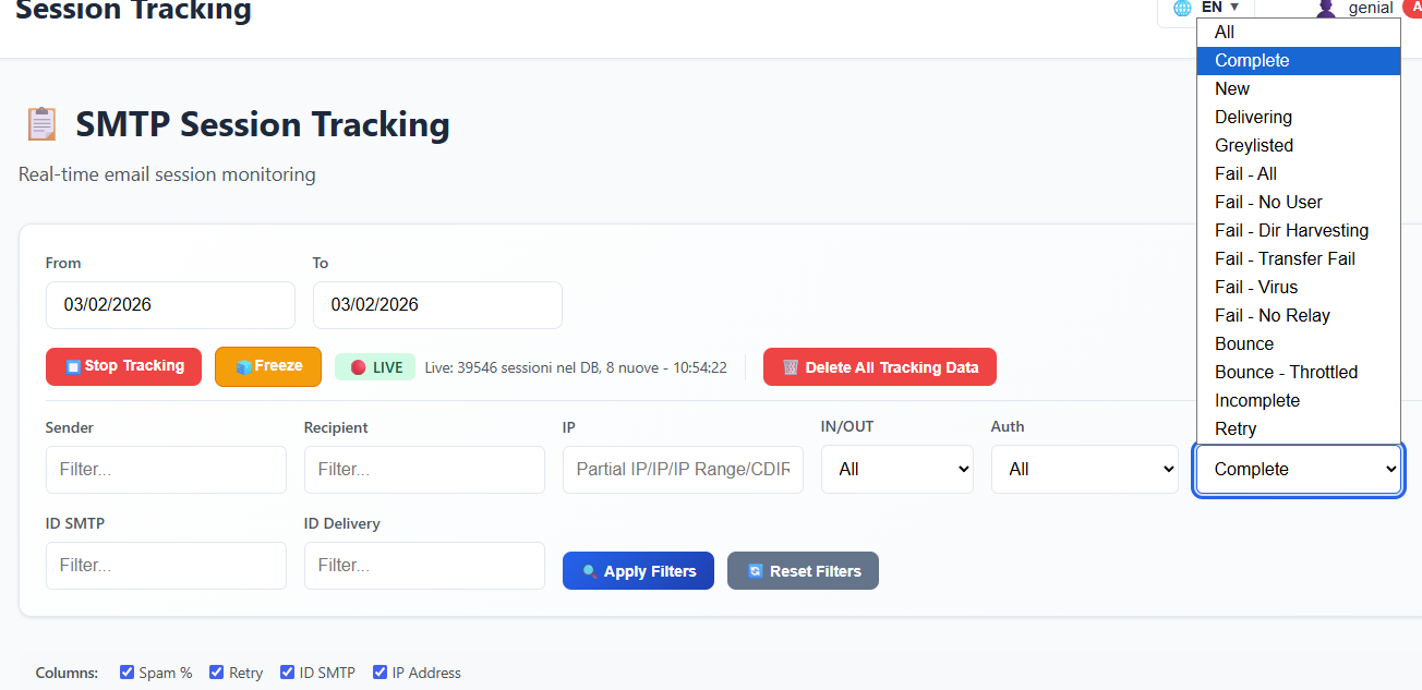 - Real-time analysis of user sessions (from SMTP to anti-spam to delivery) in a single screen with IP filtering
