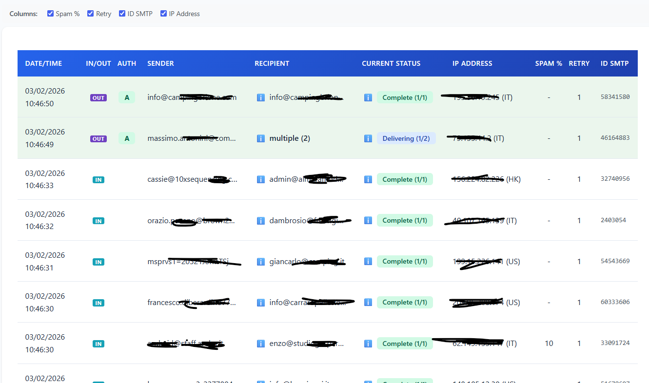 That is, a screen that collects an SMTP session in a single view, which then becomes a delivery, passing through an anti-spam check.
