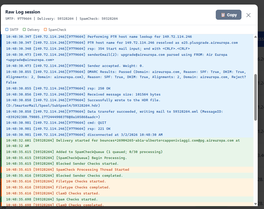 View the SMTP delivery and spamcheck session merge log