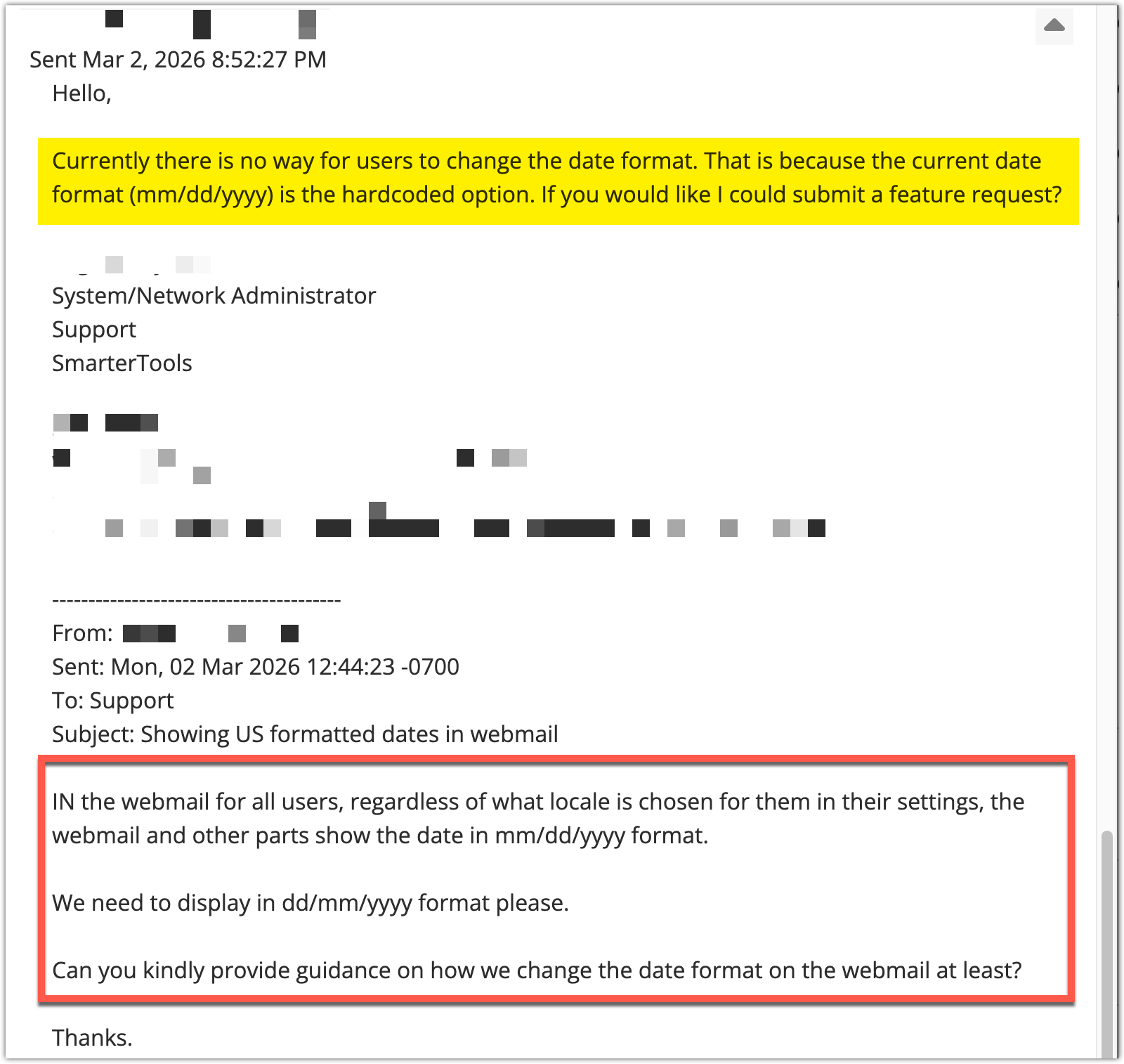 In SmarterMail, the date format used in webmail is determined by the language configured on the user account, not the server operating system locale.